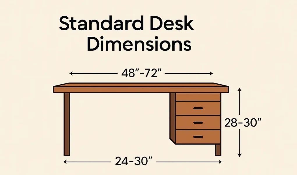 Standard writing desk dimensions include 76–152 cm width, 45–75 cm depth, and 71–76 cm height, with compact desks starting at 60 cm width and large executive writing tables extending to 183 cm for multi-document work.